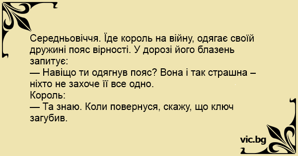 Един Крал тръгнал на война. И както си му е редът, сложил железни гащи на кралицата и ги заключил с катинар. По пътя, шутът му казал: –Защо й сложи железни гащи, та тя е толкова грозна, горката, че никой няма да и посегне. –Точно затова, казал Кралят, като се върнем, ще й кажа, че съм загубил...