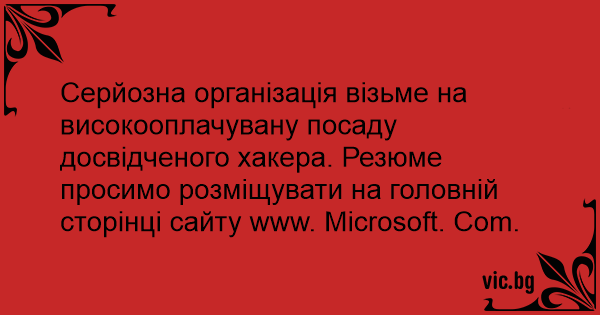 Серйозна організація візьме на високооплачувану посаду досвідченого хакера. Резюме просимо розміщувати на головній сторінці сайту www. Microsoft. Com.