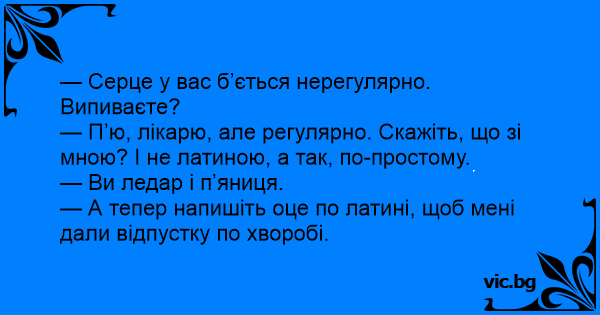 — П’ю, лікарю, але регулярно. Скажіть, що зі мною? І не латиною, а так, по-простому.