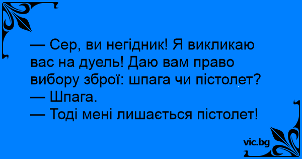 — Сер, ви негідник! Я викликаю вас на дуель! Даю вам право вибору зброї: шпага чи пістолет?