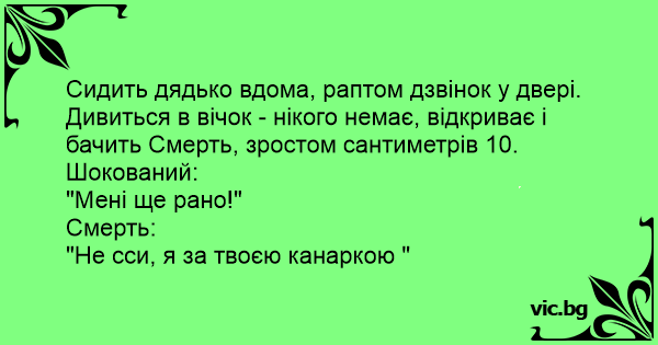 Сидить дядько вдома, раптом дзвінок у двері. Дивиться в вічок - нікого немає, відкриває і бачить Смерть, зростом сантиметрів 10.