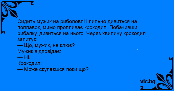 Сидить мужик на риболовлі і пильно дивиться на поплавок, мимо пропливає крокодил. Побачивши рибалку, дивиться на нього. Через хвилину крокодил запитує: