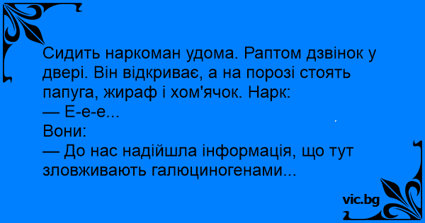 Сидить наркоман удома. Раптом дзвінок у двері. Він відкриває, а на порозі стоять папуга, жираф і хом'ячок. Нарк: