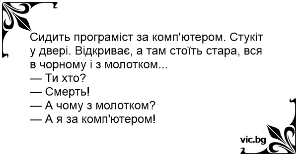 Сидить програміст за комп'ютером. Стукіт у двері. Відкриває, а там стоїть стара, вся в чорному і з молотком...