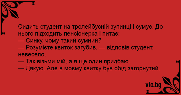 Сидить студент на тролейбусній зупинці і сумує. До нього підходить пенсіонерка і питає:
