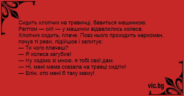 Сидить хлопчик на травичці, бавиться машинкою. Раптом — ой! — у машинки відвалились колеса. Хлопчик сидить, плаче. Повз нього проходить наркоман, почув ті реви, підійшов і запитує: