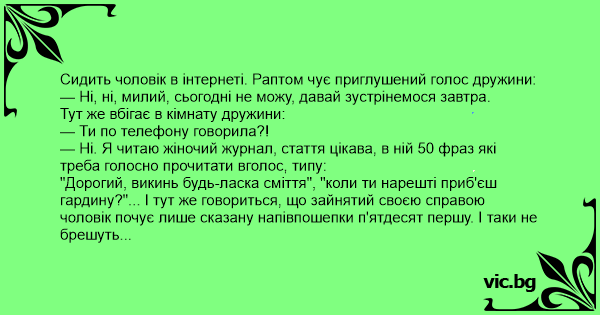 — Ні. Я читаю жіночий журнал, стаття цікава, в ній 50 фраз які треба голосно прочитати вголос, типу: