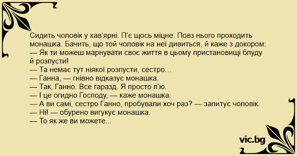 Сидить чоловік у кав’ярні. П’є щось міцне. Повз нього проходить монашка. Бачить, що той чоловік на неї дивиться, й каже з докором: