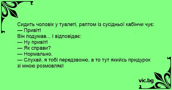 Заходит мужик в туалет. Снял штаны, Сел, срёт. За стенкой слышит голос : Привет! - Привет! - Как дела ? - Нормально. - Что делаешь? - Сру! Потом слышит: Ты извини, я тебе по позже позваню, а то тут какой-то придурак за стенкой на мои вопросы отвечает.