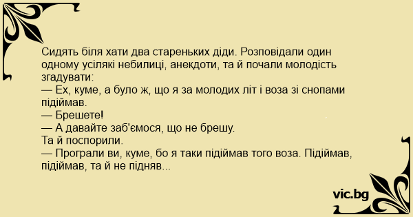 — Програли ви, куме, бо я таки підіймав того воза. Підіймав, підіймав, та й не підняв...