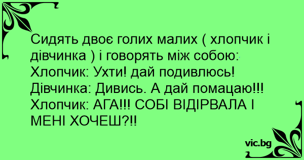 Сидять двоє голих малих ( хлопчик і дівчинка ) і говорять між собою: