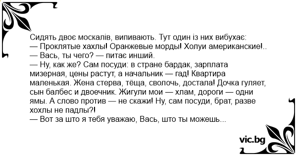 — Ну, как же? Сам посуди: в стране бардак, зарплата мизерная, цены растут, а начальник — гад! Квартира маленькая. Жена стерва, тёща, cboлoчь, достала! Дочка гуляет, сын балбес и двоечник. Жигули мои — хлам, дороги — одни ямы. А слово против — не скажи! Ну, сам посуди, брат, разве хохлы не падлы?!
