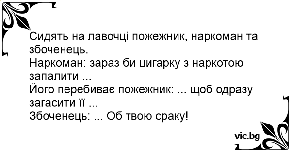 Сидять на лавочці пожежник, наркоман та збоченець.