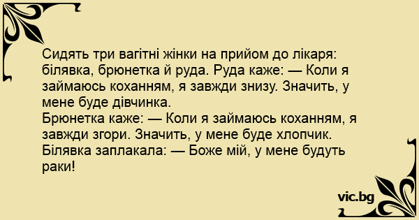 Сидять три вагітні жінки на прийом до лікаря: білявка, брюнетка й руда. Руда каже: — Коли я займаюсь коханням, я завжди знизу. Значить, у мене буде дівчинка.