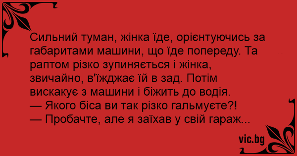 Сильний туман, жінка їде, орієнтуючись за габаритами машини, що їде попереду. Та раптом різко зупиняється і жінка, звичайно, в'їжджає їй в зад. Потім вискакує з машини і біжить до водія.