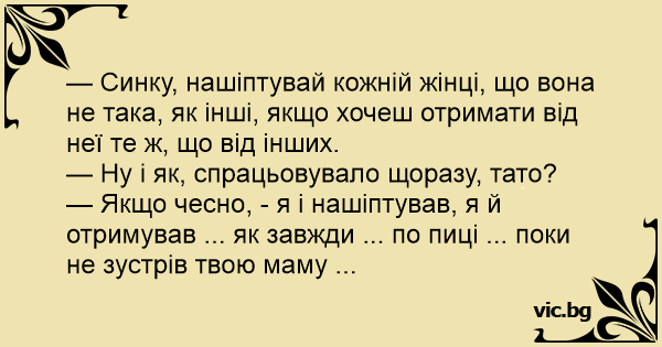 — Синку, нашіптувай кожній жінці, що вона не така, як інші, якщо хочеш отримати від неї те ж, що від інших.