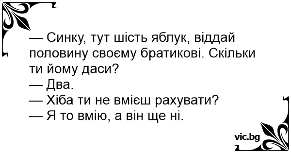 — Синку, тут шість яблук, віддай половину своєму братикові. Скільки ти йому даси?