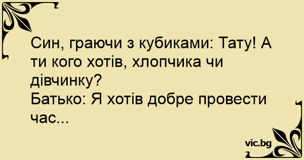 — Тато, а ти кого більше хотів - хлопчика чи дівчинку? — Взагалі-то, синку, я просто хотів приємно провести час ...
