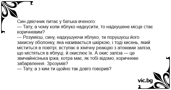 — Розумієш, сину, надкушуючи яблуко, ти порушуєш його захисну оболонку, яка називається шкіркою, і тоді кисень, який міститься в повітрі, вступає в хімічну реакцію з атомами заліза, що містяться в яблуці, й окислює їх. А окис заліза — це звичайнісінька іржа, котра має, як тобі відомо, коричневе забарвлення. Зрозумів?