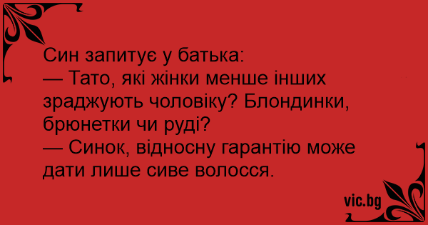 — Тато, які жінки менше інших зраджують чоловіку? Блондинки, брюнетки чи руді?