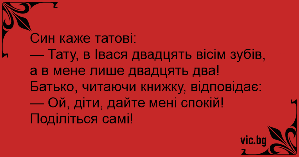 — Тату, в Івася двадцять вісім зубів, а в мене лише двадцять два!