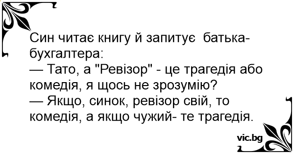 — Тато, а "Ревізор" - це трагедія або комедія, я щось не зрозумію?