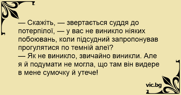 — Скажіть, — звертається суддя до потерпілої, — у вас не виникло ніяких побоювань, коли підсудний запропонував прогулятися по темній алеї?
