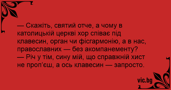 — Скажіть, святий отче, а чому в католицькій церкві хор співає під клавесин, орган чи фісгармонію, а в нас, православних — без акомпанементу?