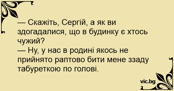 — Ну, у нас в родині якось не прийнято раптово бити мене ззаду табуреткою по голові.