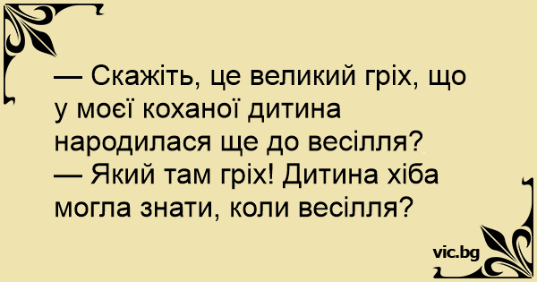 — Скажіть, це великий гріх, що у моєї коханої дитина народилася ще до весілля?