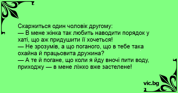 — В мене жінка так любить наводити порядок у хаті, що аж придушити її хочеться!