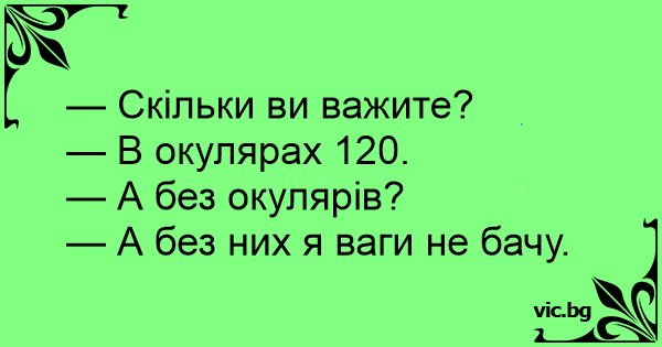 „Kolik vážíš?” ptá se jedna postarší dáma druhé. „Nó,” protahuje ta druhá, „s brýlemi padesát kilo.” „A bez brýlí?” „Bez brýlí to nepřečtu.”