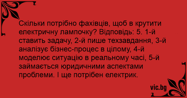 Скільки потрібно фахівців, щоб в крутити електричну лампочку? Відповідь: 5. 1-й ставить задачу, 2-й пише техзавдання, 3-й аналізує бізнес-процес в цілому, 4-й моделює ситуацію в реальному часі, 5-й займається юридичними аспектами проблеми. І ще потрібен електрик.