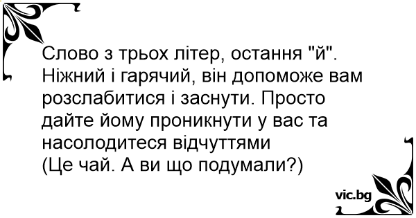 Слово з трьох літер, остання "й". Ніжний і гарячий, він допоможе вам розслабитися і заснути. Просто дайте йому проникнути у вас та насолодитеся відчуттями