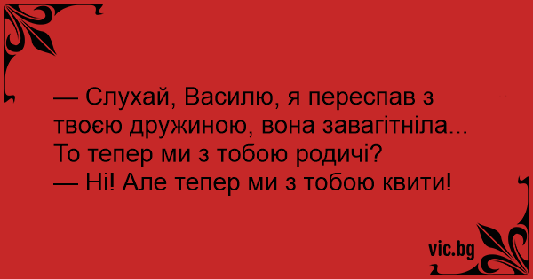 — Слухай, Василю, я переспав з твоєю дружиною, вона завагітніла... То тепер ми з тобою родичі?