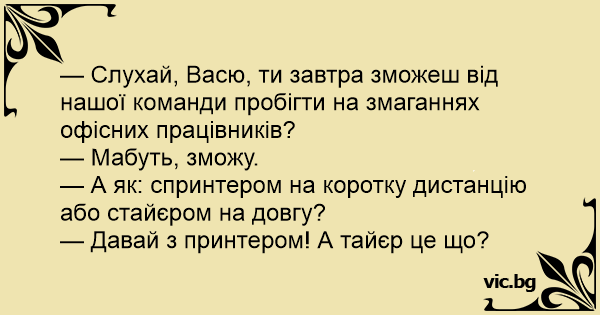 — Слухай, Васю, ти завтра зможеш від нашої команди пробігти на змаганнях офісних працівників?