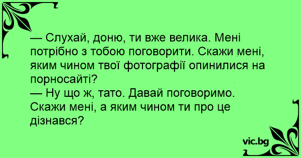 — Слухай, доню, ти вже велика. Мені потрібно з тобою поговорити. Скажи мені, яким чином твої фотографії опинилися на порносайті?