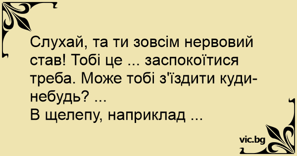Слухай, та ти зовсім нервовий став! Тобі це ... заспокоїтися треба. Може тобі з'їздити куди-небудь? ...