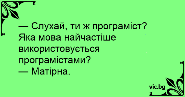 — Слухай, ти ж програміст? Яка мова найчастіше використовується програмістами?