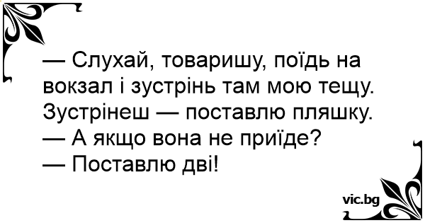 — Слухай, товаришу, поїдь на вокзал і зустрінь там мою тещу. Зустрінеш — поставлю пляшку.