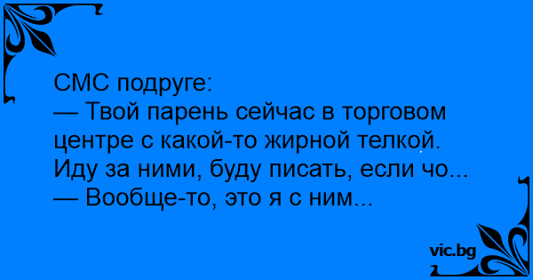— Твой парень сейчас в торговом центре с какой-то жирной телкой. Иду за ними, буду писать, если чо...