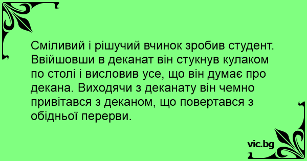 Сміливий і рішучий вчинок зробив студент. Ввійшовши в деканат він стукнув кулаком по столі і висловив усе, що він думає про декана. Виходячи з деканату він чемно привітався з деканом, що повертався з обідньої перерви.