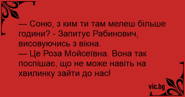 — Соню, з ким ти там мелеш більше години? - Запитує Рабинович, висовуючись з вікна.