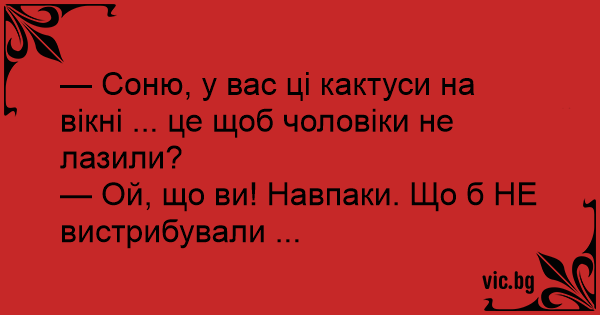 — Соню, у вас ці кактуси на вікні ... це щоб чоловіки не лазили?