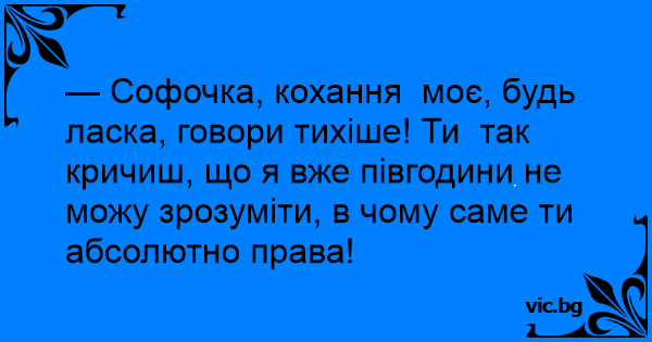— Софочка, кохання моє, будь ласка, говори тихіше! Ти так кричиш, що я вже півгодини не можу зрозуміти, в чому саме ти абсолютно права!