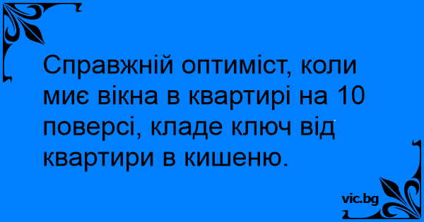 Справжній оптиміст, коли миє вікна в квартирі на 10 поверсі, кладе ключ від квартири в кишеню.