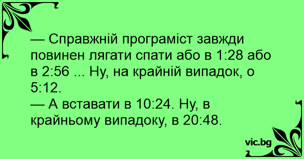 — Справжній програміст завжди повинен лягати спати або в 1:28 або в 2:56 ... Ну, на крайній випадок, о 5:12.