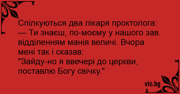 — Ти знаєш, по-моєму у нашого зав. відділенням манія величі. Вчора мені так і сказав: