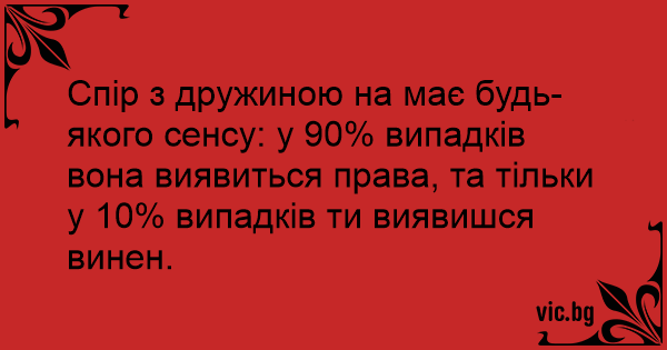 Спір з дружиною на має будь-якого сенсу: у 90% випадків вона виявиться права, та тільки у 10% випадків ти виявишся винен.