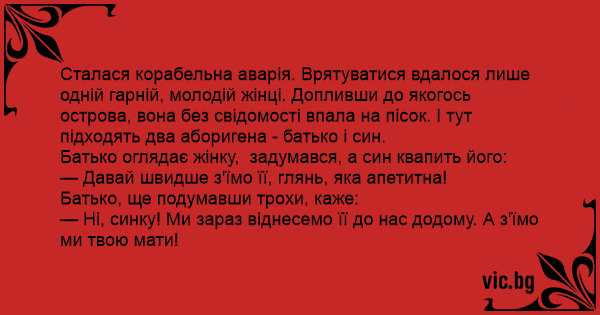 — Ні, синку! Ми зараз віднесемо її до нас додому. А з'їмо ми твою мати!